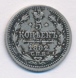 Лицевая сторона — гербовый орел, оборотная —обозначение номинала (5 копеекъ), окруженное венком из лавровой и дубовой ветвей и дата.