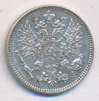 Лицевая сторона — российский двуглавый орел с гербом Великого княжества Финляндского на груди, оборотная — номинал и дата в венке из дубовых листьев. Проба — 750, нормативный вес — 2,55 грамма, гурт рубчатый.