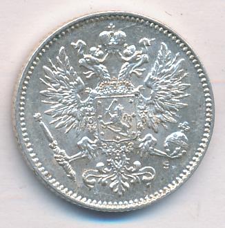 Лицевая сторона — российский двуглавый орел с гербом Великого княжества Финляндского на груди, оборотная — номинал и дата в венке из дубовых листьев. Проба — 750, нормативный вес — 2,55 грамма, гурт рубчатый.