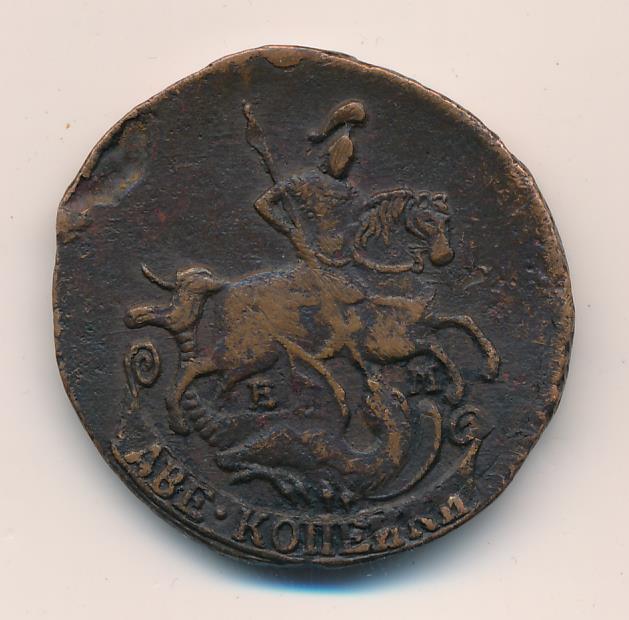 Лицевая сторона — Георгий Победоносец и обозначение номинала (две копейки) в картуше, оборотная — вензель Екатерины II и дата. Нормативный вес — 20,48 грамма, гурт — сетка или шнур.