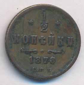 Лицевая сторона — вензель Александра II в венке из лавровой и дубовой ветвей; оборотная — обозначение номинала (1/2 копейки) и дата. Нормативный вес — 1,64 грамма, гурт рубчатый.