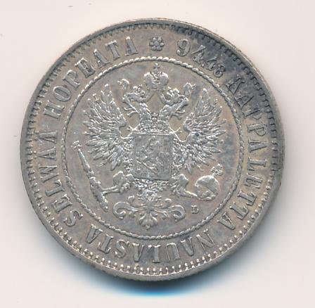 Лицевая сторона — российский двуглавый орел с гербом Великого княжества Финляндского на груди в кольцевой надписи с указанием количества штук (94,48) из фунта сплава серебра, оборотная — номинал и дата в венке из дубовых листьев. Проба — 868, нормативный вес — 5,18 грамма, гурт рубчатый.