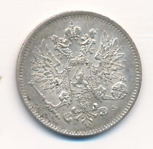 Лицевая сторона — российский двуглавый орел с гербом Великого княжества Финляндского на груди, оборотная — номинал и дата в венке из дубовых листьев. Проба — 750, нормативный вес — 1,27 грамма, гурт рубчатый.