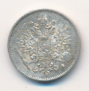 Лицевая сторона — российский двуглавый орел с гербом Великого княжества Финляндского на груди, оборотная — номинал и дата в венке из дубовых листьев. Проба — 750, нормативный вес — 1,27 грамма, гурт рубчатый.