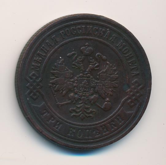 Лицевая сторона — двуглавый орел, надпись МЕДНАЯ РОССIЙСКАЯ МОНЕТА и обозначение номинала (три копейки); оборотная — обозначение номинала (3 копейки) в бусовом ободке и дата. Нормативный вес — 9,83 грамма, гурт рубчатый.