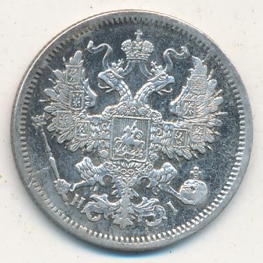 Лицевая сторона — гербовый орел, оборотная —обозначение номинала (20 копеекъ), окруженное венком из лавровой и дубовой ветвей и дата.