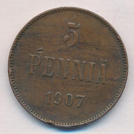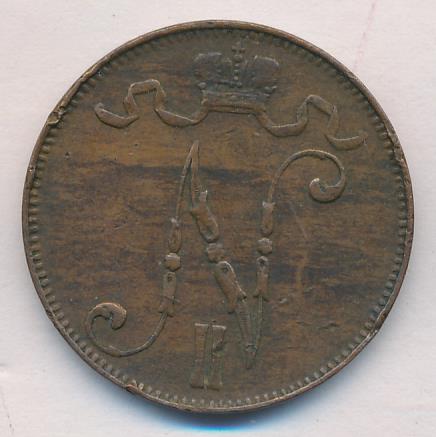 Лицевая сторона — вензель Александра II, оборотная — номинал (5 PENNIA) и дата. Нормативный вес — 6,40 грамма, гурт гладкий.