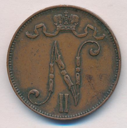 Лицевая сторона — вензель Александра II, оборотная — номинал (5 PENNIA) и дата. Нормативный вес — 6,40 грамма, гурт гладкий.