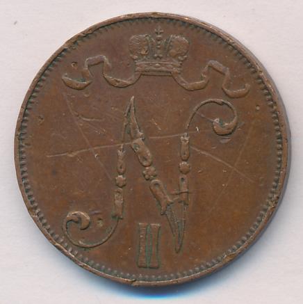 Лицевая сторона — вензель Александра II, оборотная — номинал (5 PENNIA) и дата. Нормативный вес — 6,40 грамма, гурт гладкий.