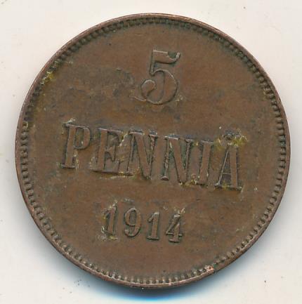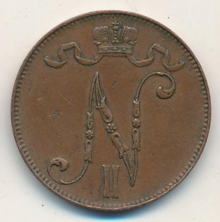 Лицевая сторона — вензель Александра II, оборотная — номинал (5 PENNIA) и дата. Нормативный вес — 6,40 грамма, гурт гладкий.