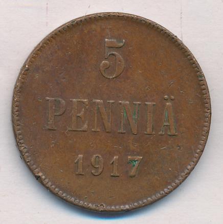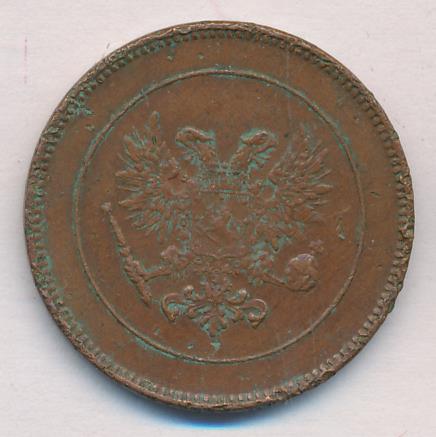 Лицевая сторона — вензель Александра II, оборотная — номинал (5 PENNIA) и дата. Нормативный вес — 6,40 грамма, гурт гладкий.