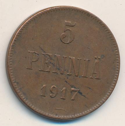 Лицевая сторона — вензель Александра II, оборотная — номинал (5 PENNIA) и дата. Нормативный вес — 6,40 грамма, гурт гладкий.