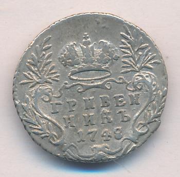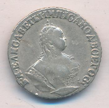 Лицевая сторона — портрет и надпись «Б М Елисаветъ I IMP I САМОД ВСЕРОС», оборотная — обозначение номинала (гривенникъ) и дата. Проба — 750 (с 1746 года - 802), нормативный вес — 2,59 грамма (с 1755 года — 2,42). Гурт — шнур.