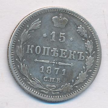 Лицевая сторона — гербовый орел, оборотная —обозначение номинала (15 копеекъ), окруженное венком из лавровой и дубовой ветвей и дата.