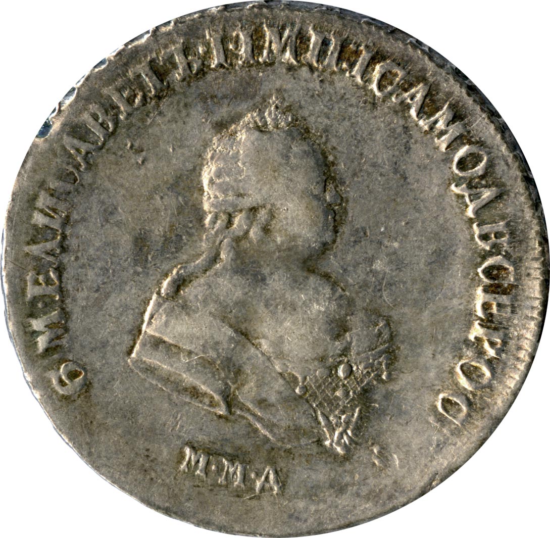 Красный двор в Москве начинает тиснение монет с портретом Елизаветы в 1742 году. Портрет на московских монетах существенно отличается от петербургских типов. Правое плечо не прикрыто плащом, под бюстом знак ордена Св. Андрея. Оформление портрета несколько меняется в 1754 году — шея становится короче, а орденская лента уже.