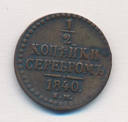 На новых монетах равенство серебряному курсу указано прямо в номинале: «1/2 КОПЕЙКИ СЕРЕБРОМ». Указ об их выпуске следует 6 сентября 1840 года («О новой медной монете на серебро 16-рублевого в пуде достоинства»). Массовая чеканка началось за год до этого на Екатеринбургском (знак ЕМ) и Сузунском (знак СМ) дворах. В качестве временной меры в 1840-1843 годах к ним подключается Ижорский завод (знак СПМ). С 1844 года после «значительного скопления медной монеты в народном обращении» в Екатеринбурге производство прекращается, а в Сузуне сокращается. Варшавский двор (знак MW), получив разрешение на выпуск общегосударственной монеты, успел отчеканить ее лишь в небольшом количестве в 1848 году.