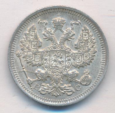 Лицевая сторона — гербовый орел, оборотная —обозначение номинала (20 копеекъ), окруженное венком из лавровой и дубовой ветвей и дата.