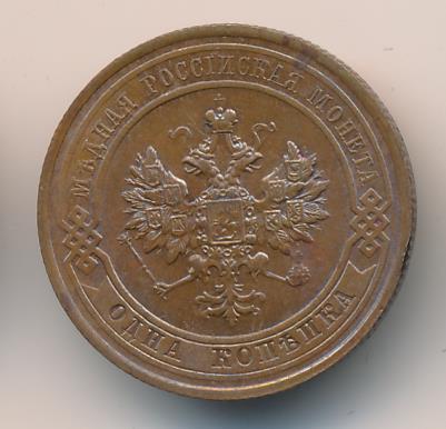 Лицевая сторона — двуглавый орел, надпись МЕДНАЯ РОССIЙСКАЯ МОНЕТА и обозначение номинала (одна копейка); оборотная — обозначение номинала (1 копейка) в бусовом ободке и дата. Нормативный вес — 3,28 грамма, гурт рубчатый.