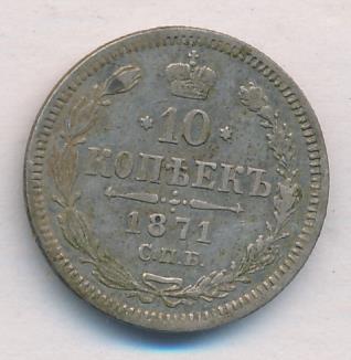 Лицевая сторона — гербовый орел, оборотная —обозначение номинала (10 копеекъ), окруженное венком из лавровой и дубовой ветвей и дата.