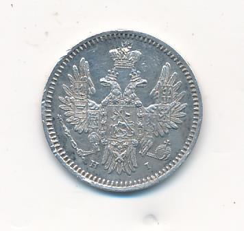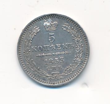 Лицевая сторона — новый гербовый орел с поднятыми крыльями, оборотная —обозначение номинала (5 копеекъ), окруженное венком из лавровой и дубовой ветвей и дата. Проба — 868, нормативный вес — 1,04 грамма.