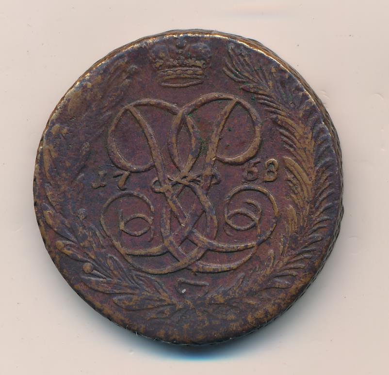 Лицевая сторона — двуглавый орел и обозначение номинала (пять копеекъ), оборотная — сложный симметричный вензель Елизаветы Петровны и дата. Нормативный вес — 51,19 грамма, гурт — сетка.