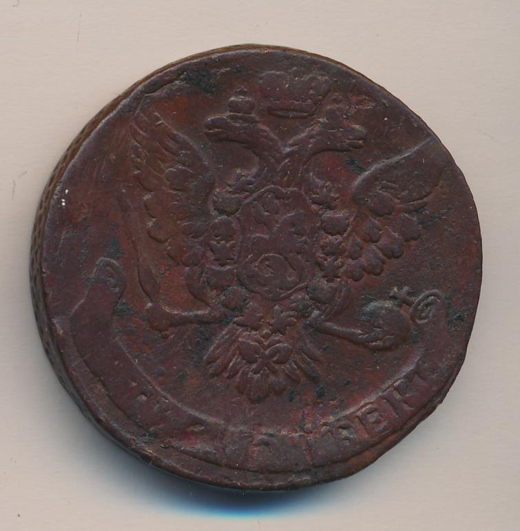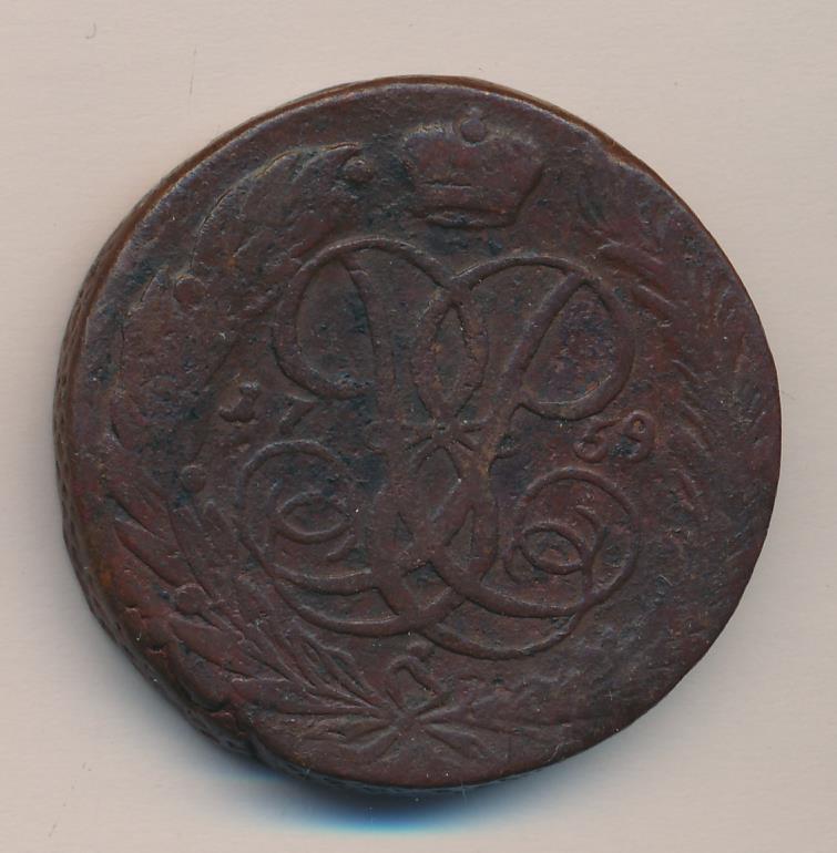 Лицевая сторона — двуглавый орел и обозначение номинала (пять копеекъ), оборотная — сложный симметричный вензель Елизаветы Петровны и дата. Нормативный вес — 51,19 грамма, гурт — сетка.