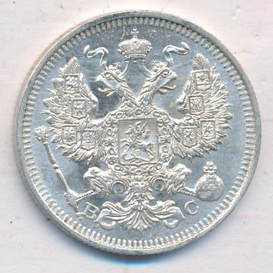 Лицевая сторона — гербовый орел, оборотная —обозначение номинала (20 копеекъ), окруженное венком из лавровой и дубовой ветвей и дата.