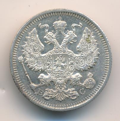 Лицевая сторона — гербовый орел, оборотная —обозначение номинала (20 копеекъ), окруженное венком из лавровой и дубовой ветвей и дата.