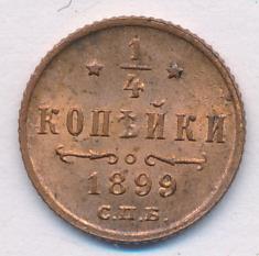 Лицевая сторона — вензель Александра II в венке из лавровой и дубовой ветвей; оборотная — обозначение номинала (1/4 копейки) и дата. Нормативный вес — 0,82 грамма, гурт рубчатый.