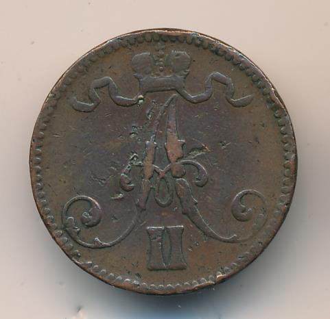 Лицевая сторона — вензель Александра II, оборотная — номинал (5 PENNIA) и дата. Нормативный вес — 6,40 грамма, гурт гладкий.