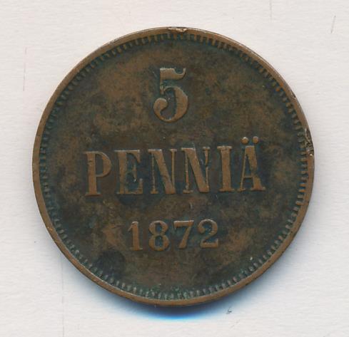 Лицевая сторона — вензель Александра II, оборотная — номинал (5 PENNIA) и дата. Нормативный вес — 6,40 грамма, гурт гладкий.