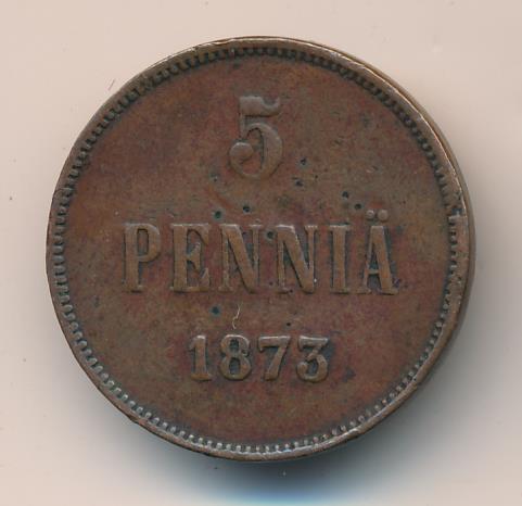 Лицевая сторона — вензель Александра II, оборотная — номинал (5 PENNIA) и дата. Нормативный вес — 6,40 грамма, гурт гладкий.