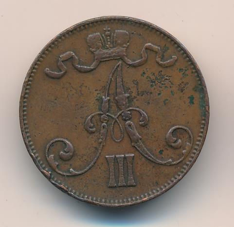 Лицевая сторона — вензель Александра II, оборотная — номинал (5 PENNIA) и дата. Нормативный вес — 6,40 грамма, гурт гладкий.