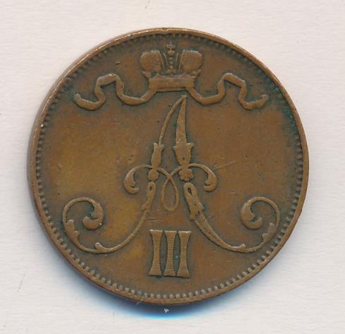 Лицевая сторона — вензель Александра II, оборотная — номинал (5 PENNIA) и дата. Нормативный вес — 6,40 грамма, гурт гладкий.