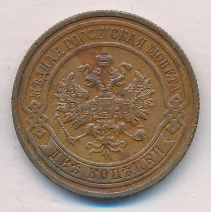 Лицевая сторона — двуглавый орел, надпись МЕДНАЯ РОССIЙСКАЯ МОНЕТА и обозначение номинала (две копейки); оборотная — обозначение номинала (2 копейки) в бусовом ободке и дата. Нормативный вес — 6,55 грамма, гурт рубчатый.