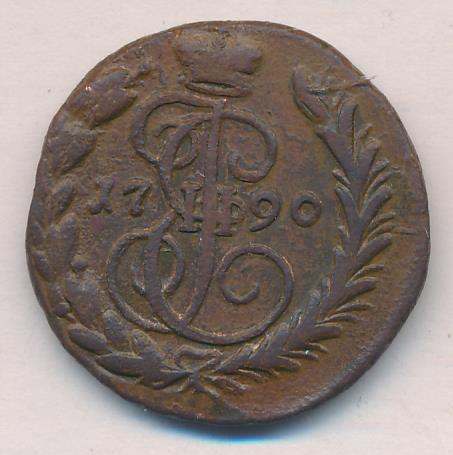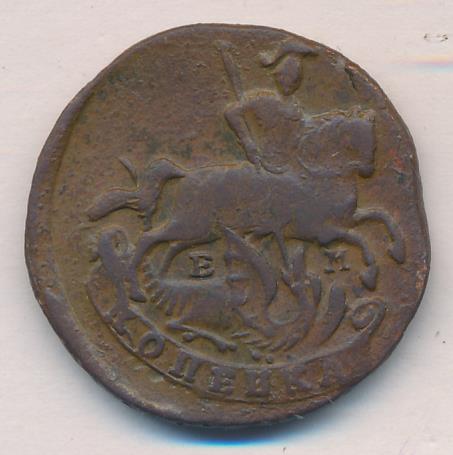 Лицевая сторона — Георгий Победоносец и обозначение номинала (копейка) в картуше, оборотная — вензель Екатерины II и дата. Нормативный вес — 10,24 грамма, гурт — сетка, или узор, или шнур.
