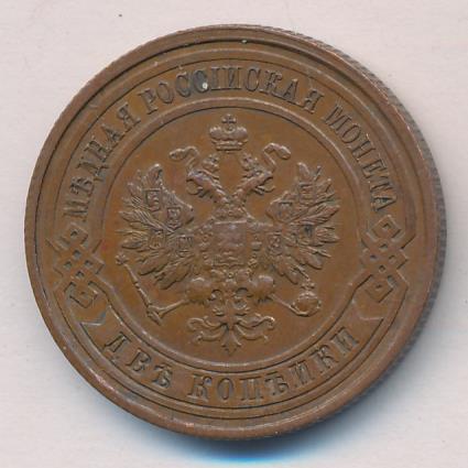 Лицевая сторона — двуглавый орел, надпись МЕДНАЯ РОССIЙСКАЯ МОНЕТА и обозначение номинала (две копейки); оборотная — обозначение номинала (2 копейки) в бусовом ободке и дата. Нормативный вес — 6,55 грамма, гурт рубчатый.