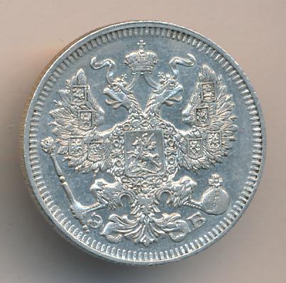 Лицевая сторона — гербовый орел, оборотная —обозначение номинала (20 копеекъ), окруженное венком из лавровой и дубовой ветвей и дата.