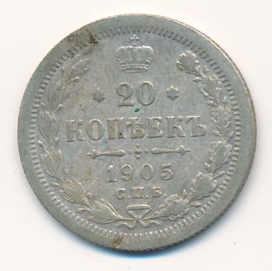 Лицевая сторона — гербовый орел, оборотная —обозначение номинала (20 копеекъ), окруженное венком из лавровой и дубовой ветвей и дата.