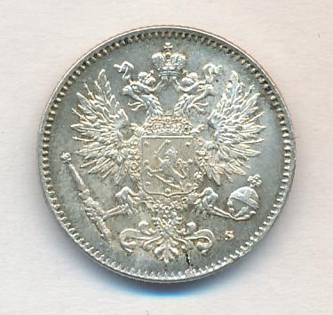 Лицевая сторона — российский двуглавый орел с гербом Великого княжества Финляндского на груди, оборотная — номинал и дата в венке из дубовых листьев. Проба — 750, нормативный вес — 2,55 грамма, гурт рубчатый.