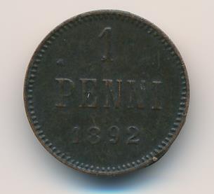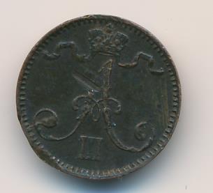 Лицевая сторона — вензель Александра II, оборотная — номинал (1 PENNIA) и дата. Нормативный вес — 1,28 грамма, гурт гладкий.