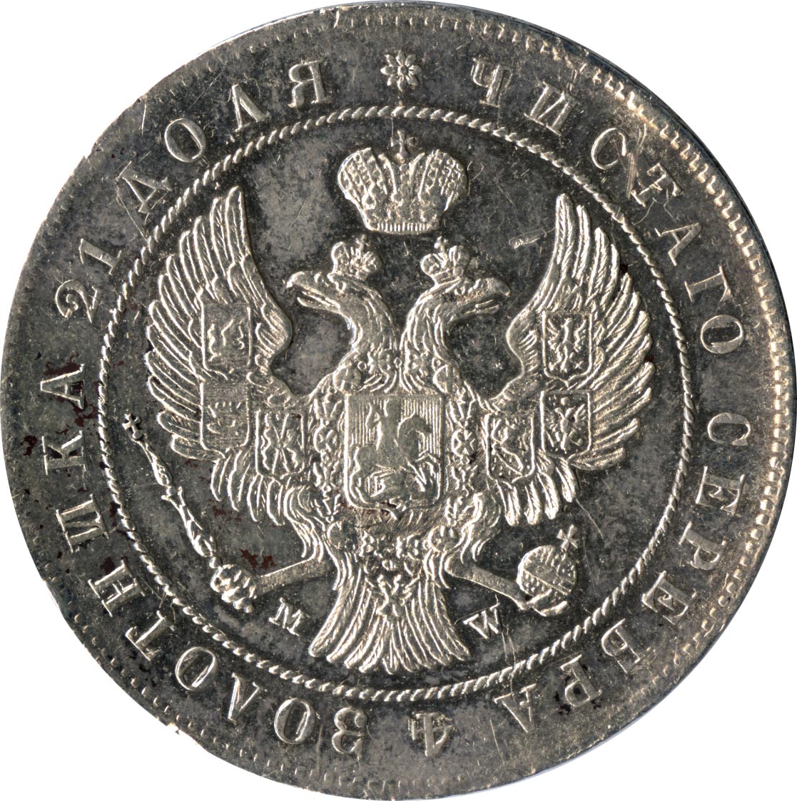 В январе 1830 года Николай I дает министру финансов Е. Ф. Канкрину устное указание «о сделании на золотых и серебряных монетах орла как на платиновых». На новом гербе крылья орла подняты, на них размещены шесть местных гербов — казанский, астраханский, сибирский, польский, херсонесский и финляндский. На груди орла — московский герб, на головах — короны. С 1832 года заодно с орлом изменяются и композиции обеих сторон монет: на лицевой стороне содержание чистого серебра в монете теперь обозначает круговая надпись, слово МОНЕТА на оборотной подчеркивает нарицательную стоимость, отличая полновесное денежное средство от рубля ассигнациями (нужно помнить, что доставшаяся Николаю в наследство от трех прежних правлений масса обесцененных бумажных денег является острой экономической проблемой. Правительство Николая удерживает объем ассигнаций строго на одном уровне, не прибегая к дополнительным эмиссиям; курс рубля ассигнациями колеблется вокруг 35 копеек).
