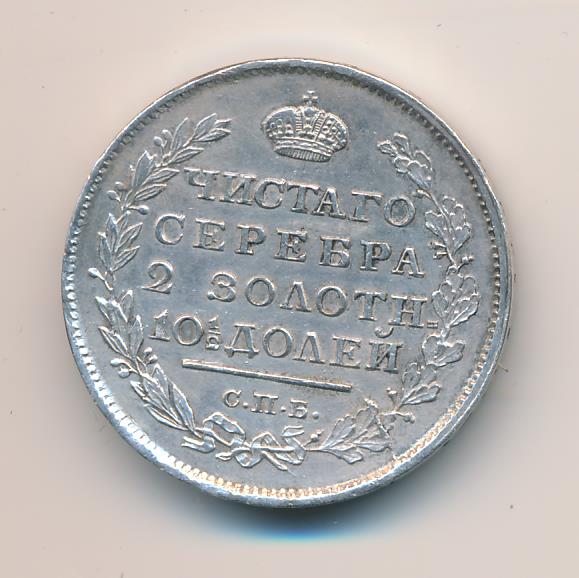 Лицевая сторона - двуглавый орел, дата и надпись «МОНЕТА РУБЛЬ», оборотная — окруженная венком из лавровой и дубовой ветвей надпись «ЧИСТАГО СЕРЕБРА 2 ЗОЛОТН 10 ДОЛЕЙ». Проба — 868, нормативный вес — 10,37 грамма.