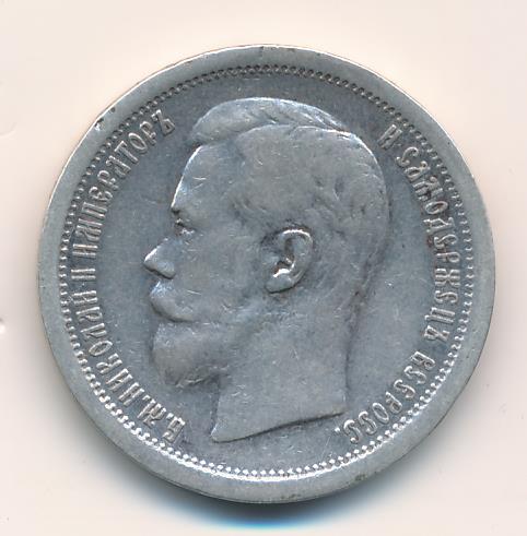 Лицевая сторона — портрет Николая II в круговой надписи «Б.М. НИКОЛАЙ II ИМПЕРАТОРЪ И САМОДЕРЖЕЦЪ ВСЕРОСС», оборотная — двуглавый орел, обозначение номинала (50 копеекъ) и дата.