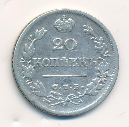 Лицевая сторона - двуглавый орел и дата, оборотная — обозначение номинала (20 копеекъ) в венке из лавровой и дубовой ветвей. Проба до 1813 года — 750, нормативный вес — 4,80 грамма; после 1813 года — проба 868, нормативный вес — 4,15 грамма.