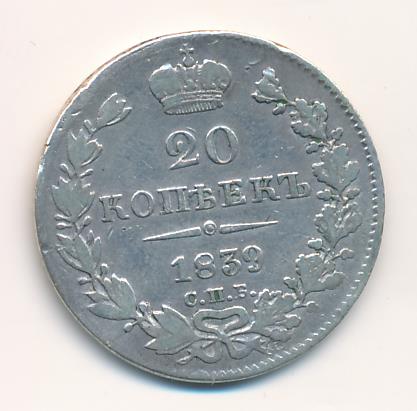 Лицевая сторона — новый гербовый орел с поднятыми крыльями, оборотная —обозначение номинала (20 копеекъ), окруженное венком из лавровой и дубовой ветвей и дата. Проба — 868, нормативный вес — 4,15 грамма.