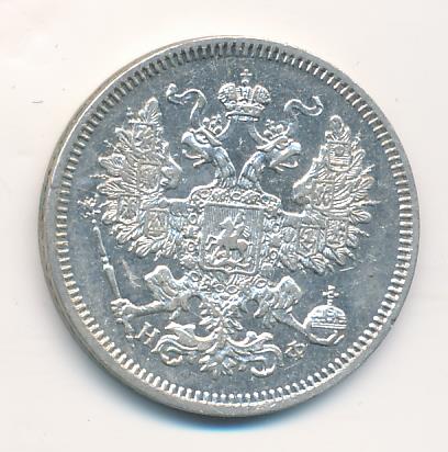 Лицевая сторона — гербовый орел, оборотная —обозначение номинала (20 копеекъ), окруженное венком из лавровой и дубовой ветвей и дата.