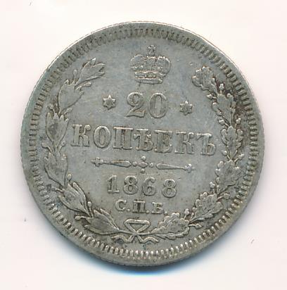 Лицевая сторона — гербовый орел, оборотная —обозначение номинала (20 копеекъ), окруженное венком из лавровой и дубовой ветвей и дата.