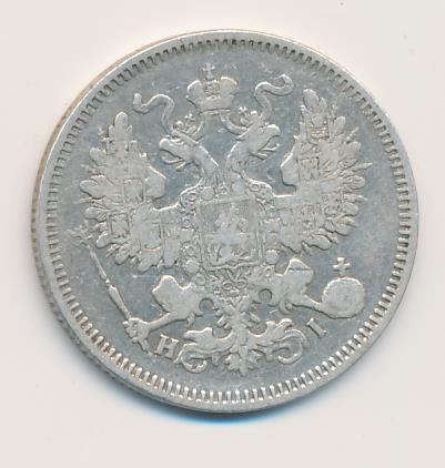 Лицевая сторона — гербовый орел, оборотная —обозначение номинала (20 копеекъ), окруженное венком из лавровой и дубовой ветвей и дата.