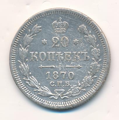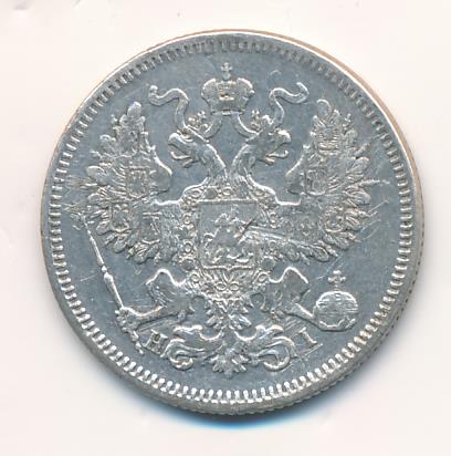 Лицевая сторона — гербовый орел, оборотная —обозначение номинала (20 копеекъ), окруженное венком из лавровой и дубовой ветвей и дата.